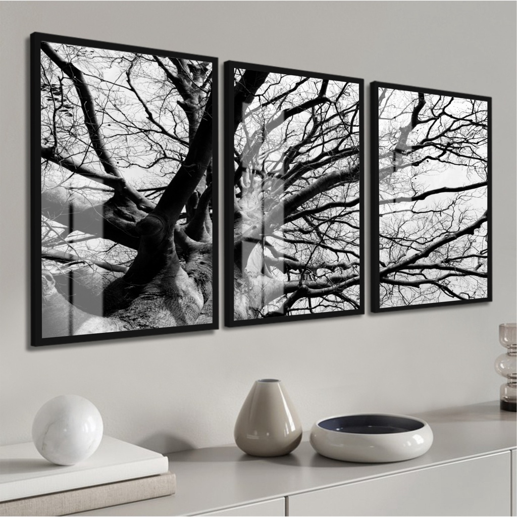 Kit 3 Quadros Decorativos Galhos Preto e Branco Arvore Para Sala Quarto Casa Com Moldura e Vidro