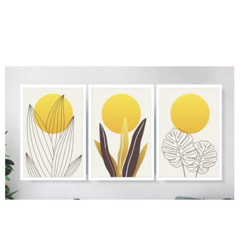 Kit 3 Quadros Decorativos Abstrato Geométrico Floral Amarelo Com Moldura Para Sala De Estar Quarto De Casal Corredor Casa Hall