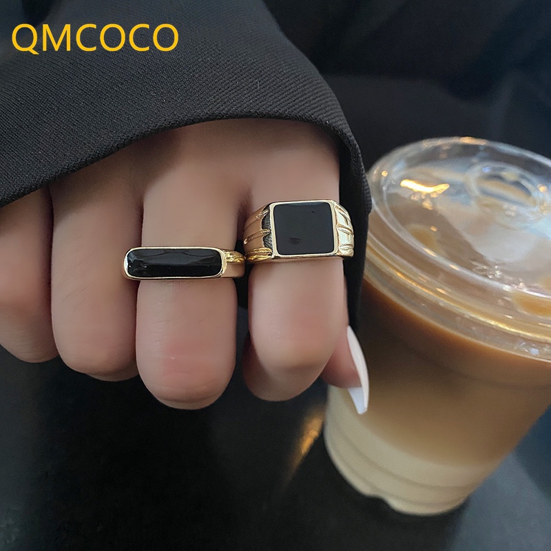 QMCOCO Prata Ouro Cor Anéis Da Moda Para Mulheres Vintage Minimalista Artesanal Pedra Preta Jóias Punk Hip-Hop Party Gift