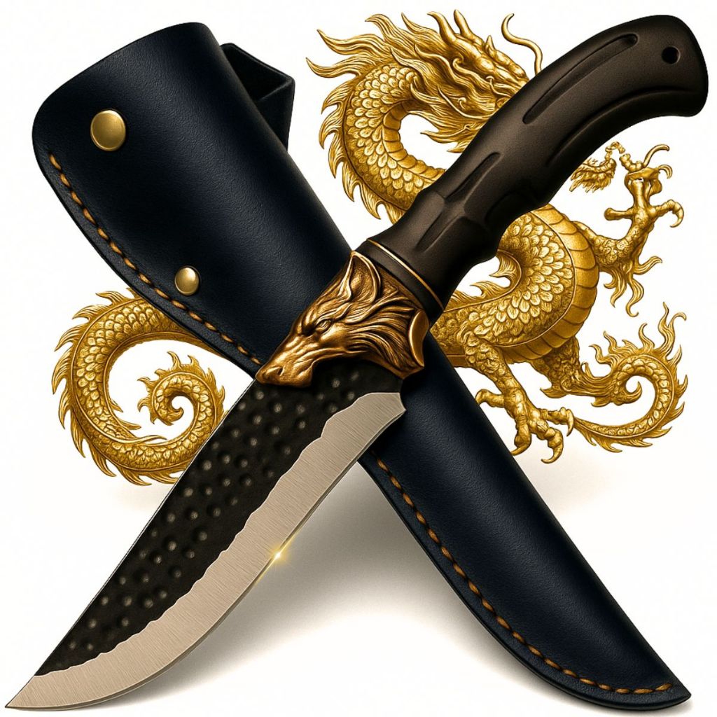 Faca Premium de Acampamento e Churrasco Aventuras Lâmina de Aço e Detalhe em Bronze – Dragão Dourado com Coldre Incluso