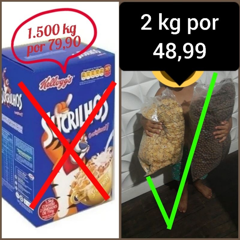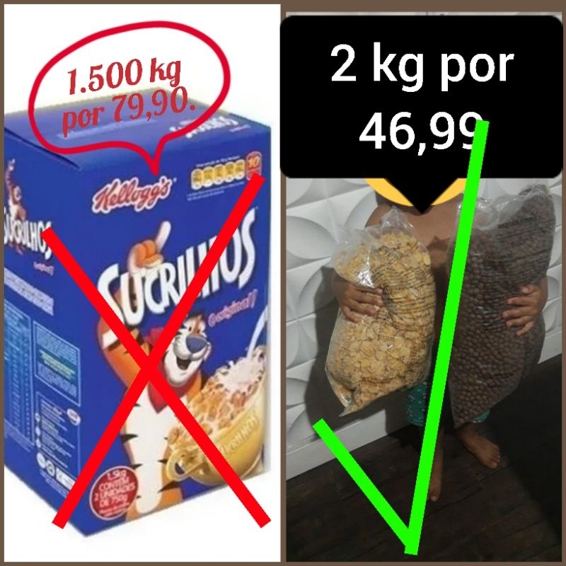Sucrilhos e Cereal Matinal Pacotão Tamanho Família 2KG 3 Sabores( sucrilho comum açucarado/bolinhas de chocolate/ colorido sabor frutas)166/255