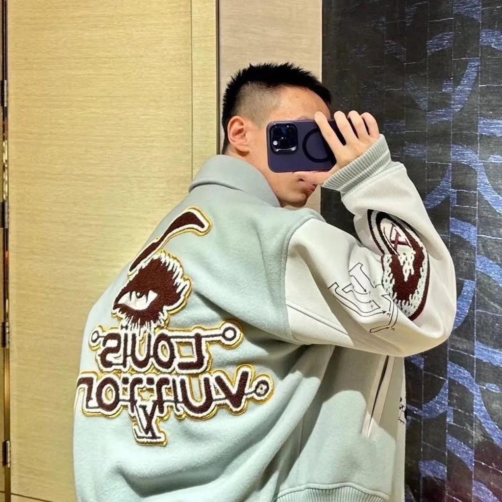 LOUIS VUITTON bordado americano baseball jaleco casual casal alfabeto casual pilot toalha solta flocada jaqueta de moda masculina e feminina KJUB