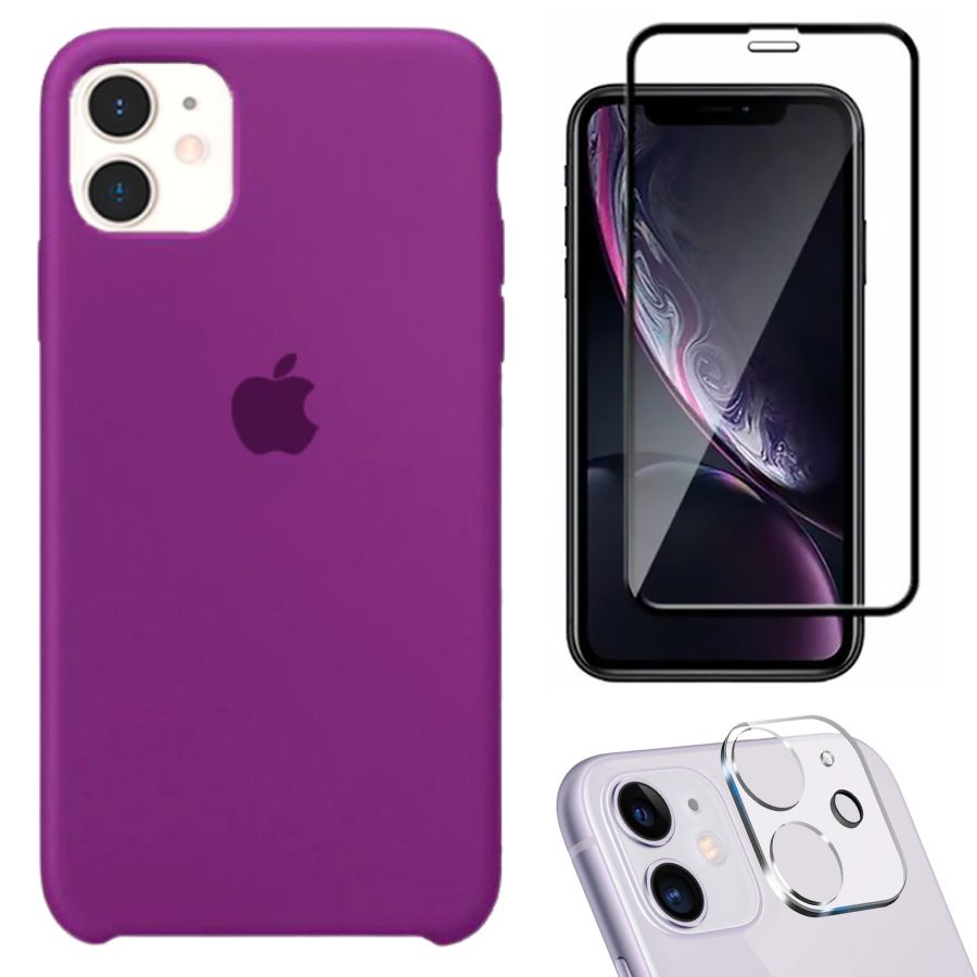 Kit 3em1 Compatível Com iPhone 11 - Capa Case Silicone Aveludada + Película Tela 3D + Película de Câmera