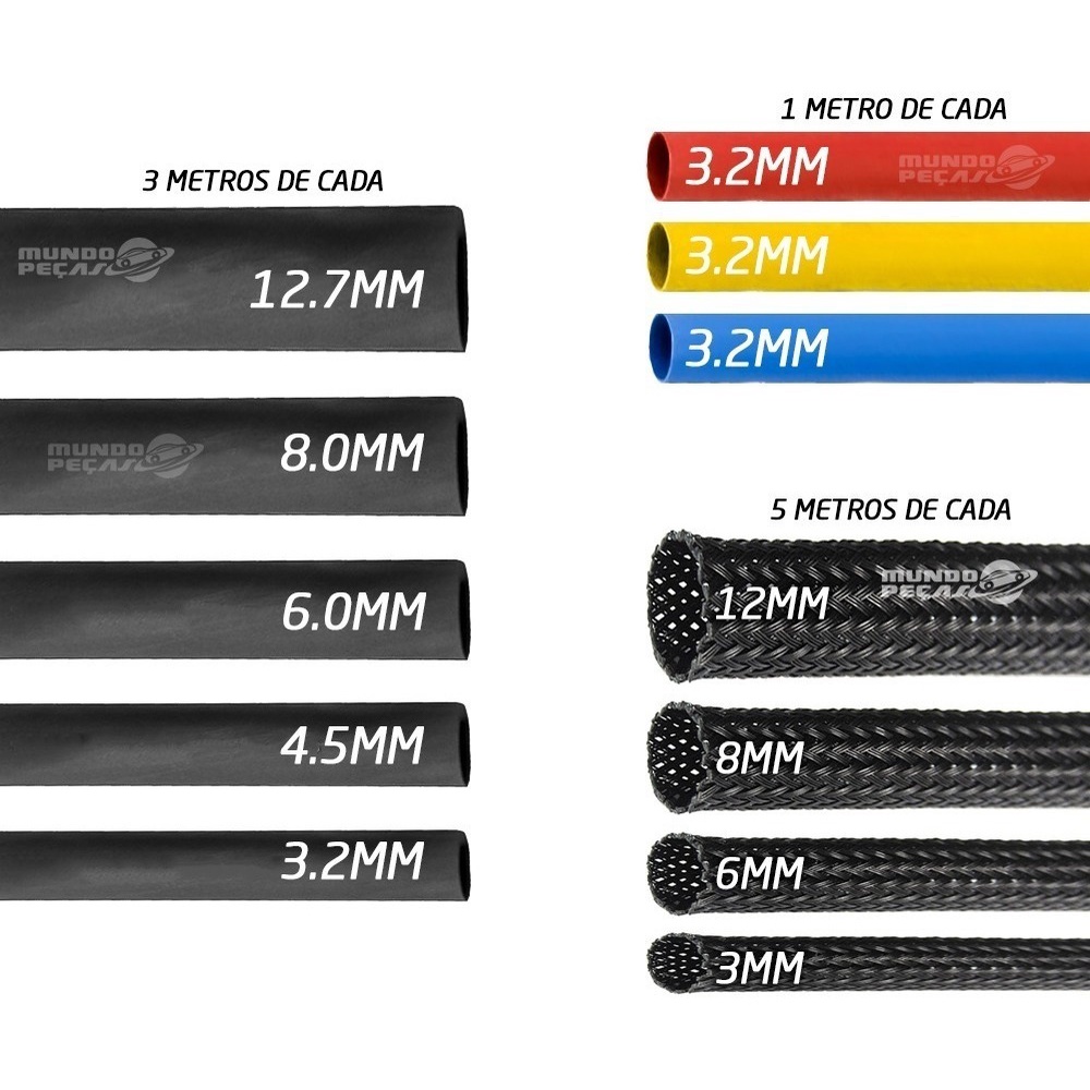 Kit malha náutica expansiva 3mm 6mm 10mm 16mm + termo retrátil. Kit perfeito para revestimento em cabos e chicotes elétricos. Solução profissional. Malha expansível para chicotes, Kit malha náutica para revestimento de som automotivo