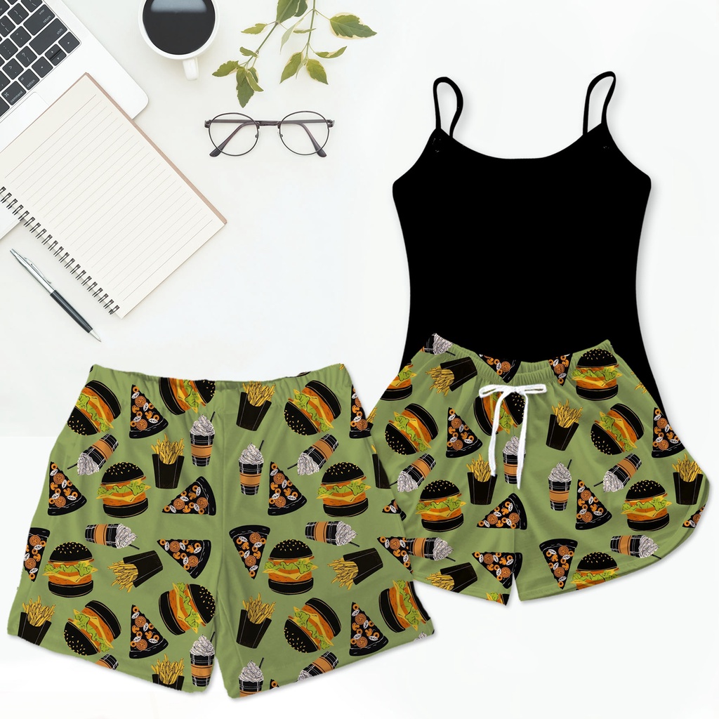 Kit Pijama Casal Baby Doll Preto Mozão Pizza Hamburguer Fast Food