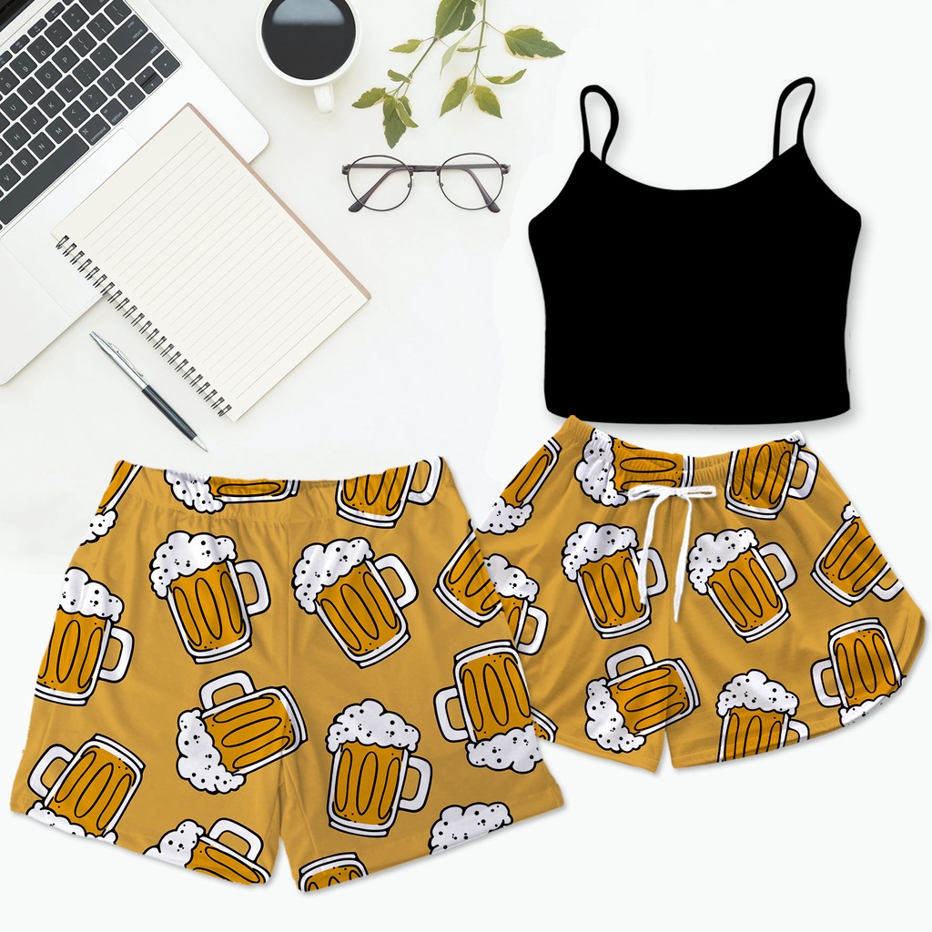 Kit Pijama Casal Mozão Baby Doll Feminino Cropped Preto + Shorts Masculino Samba Canção Cerveja