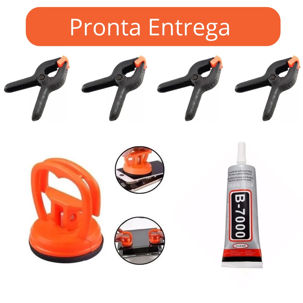 Kit Cola Transparente B7000 110ml + 4 Grampo Fixação + Ventosa de Sucção ideal para reparos em celulares e tablets em geral