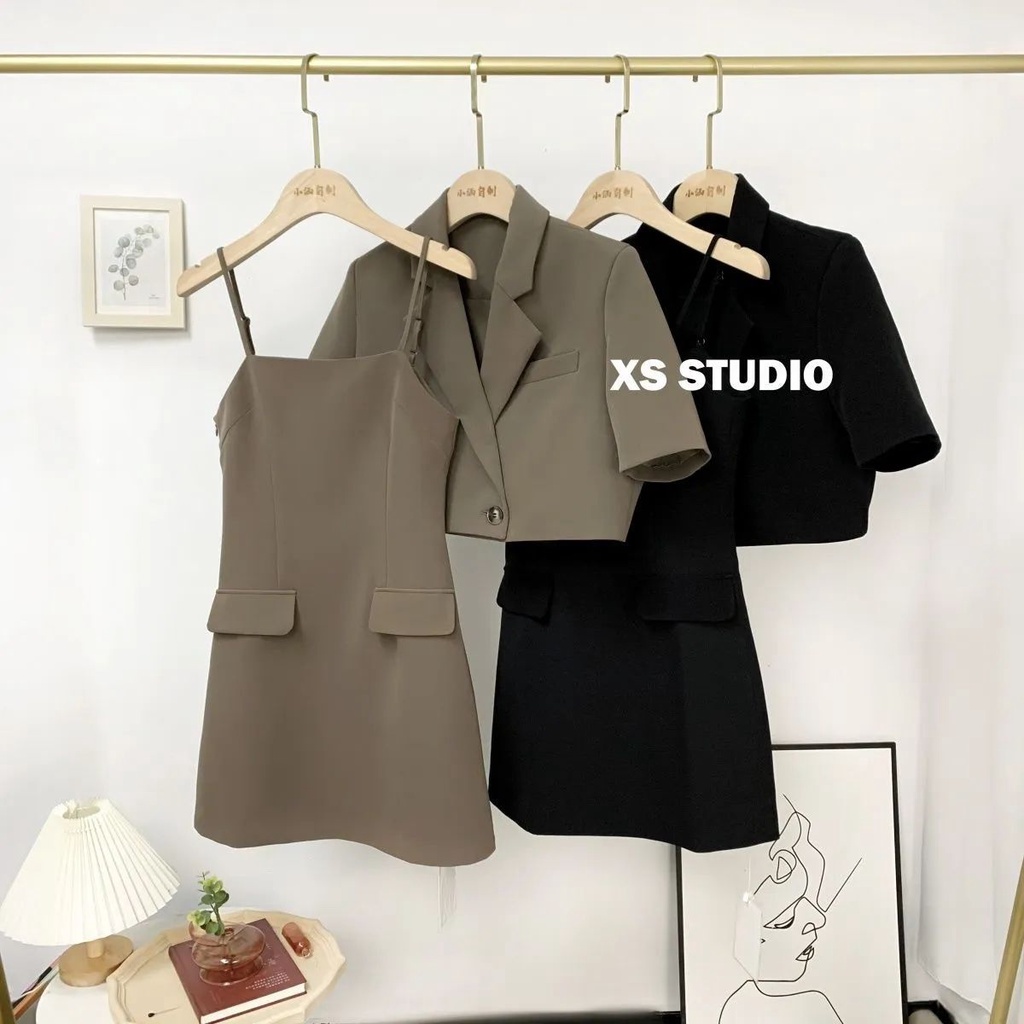 Traje De Verão Feminino Novo Estilo Retrô Jaqueta Suspensório Saia Duas Peças