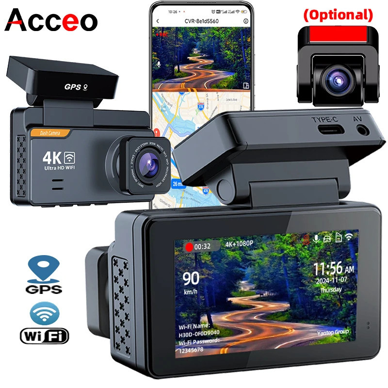 DashCam 4K Mini Gravador de Vídeo para Carro com GPS e WIFI, Suporte para Lente Dupla, Câmera de Visão Traseira 1080P, V