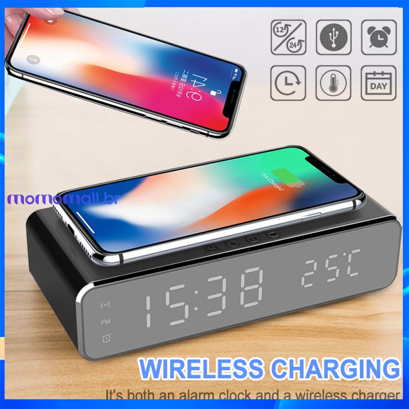 Relógio Despertador Elétrico LED/Carregador Telefônico Termômetro Sem Fio Rádio FM Digital HD De Mesa Espelho