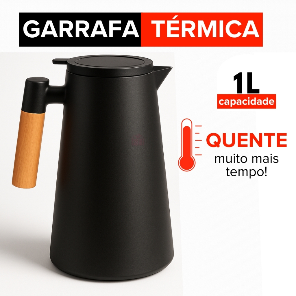 Garrafa Térmica de Café 1 Litro Preta Cabo de Madeira Café e Chá Nórdica Mantém Quente