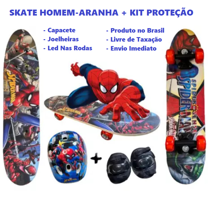 Skate Infantil Homem Aranha Vingadores + Kit Proteção Rodas Gel Com Led Prancha Lixa Antiderrapante