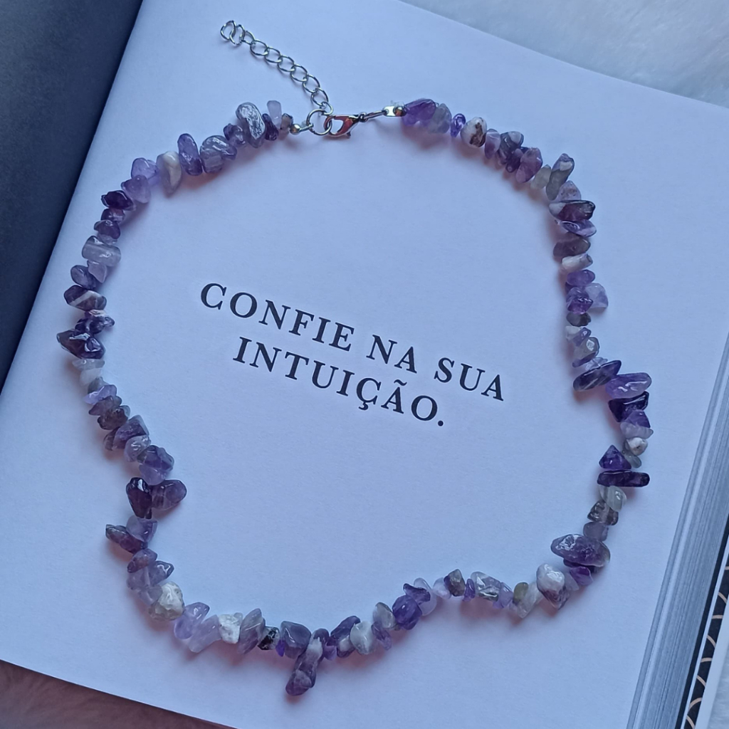 Colar Choker Cascalho de Pedra Natural Ametista Cristal Follheado a Prata Acessório