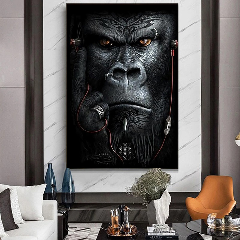 Quadro decorativo 1 peça 90x70 Gorila macaco preto fones de ouvido moderno abstrato decoração para casa sala quarto hall