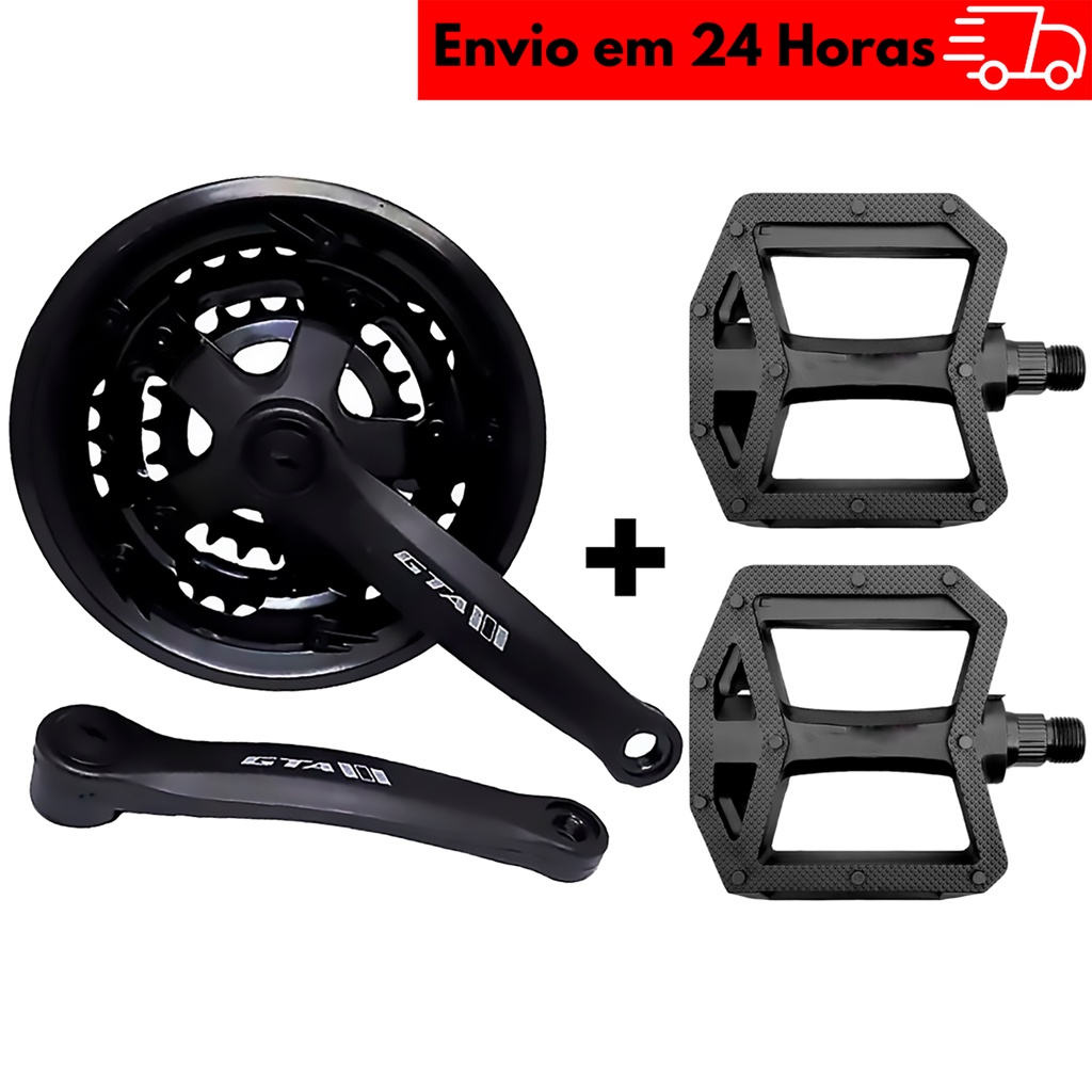 Kit Pé de Vela Para Bike Triplo Pedivela Ponta Quadrada + Pedal de Bicicleta Plataforma Rosca Grossa