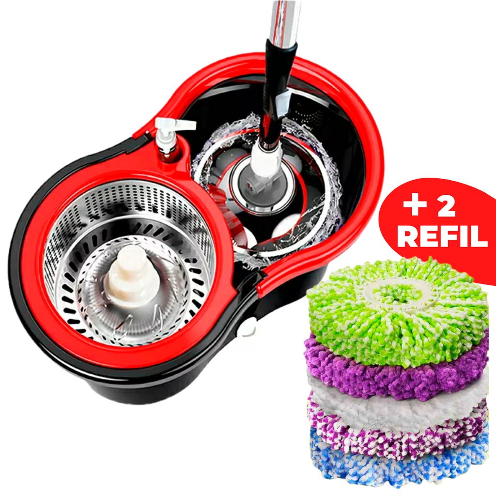 Esfregão Mop Limpeza Giratório Inox Multiuso Fit com Balde E 2 Refil Original Promoção kit