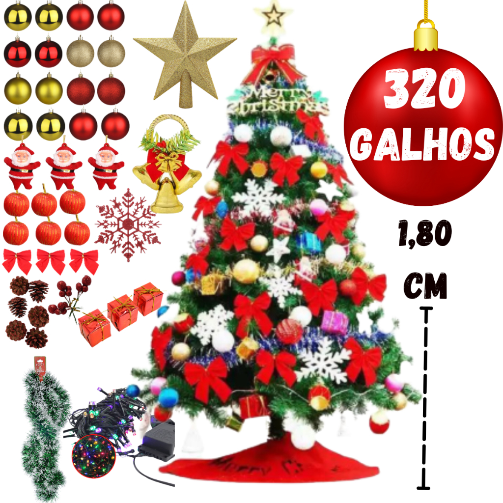 Árvore Natal Pinheiro Premium 180 cm 1,80 m 320 GALHOS Enfeitada Decorada Luxo Kit Completa Enfeites Papai Noel Natalino