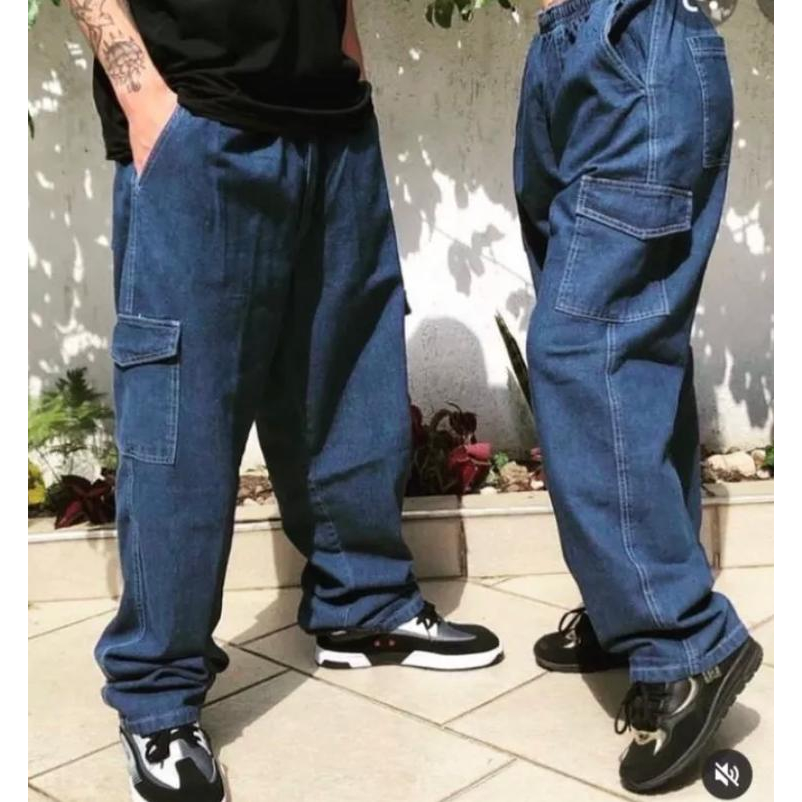 Calça balao cargo 6 bolsos sarja e jeans skatetista estilo baggy e elastico na cintura
