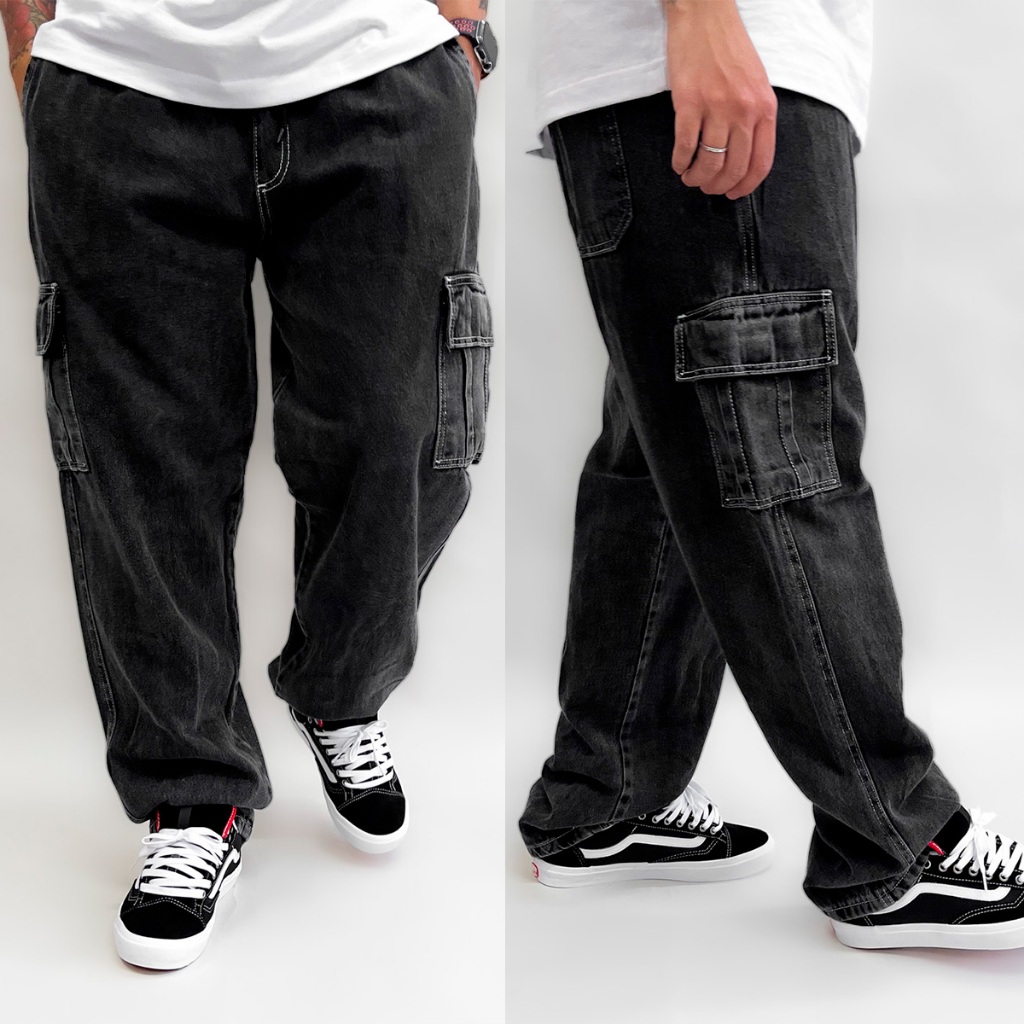 CALÇA CARGO JEANS LARGA UNISSEX SKATE 6 BOLSOS FECHAMENTO CORDÃO E ELÁSTICO NA CINTURA VARIAS CORES