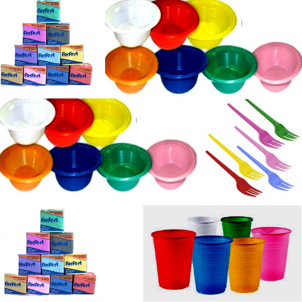 Kit Descartaveis 500 und com 100 copos neon 100 cumbucas coloridas 100 garfos neon 200 guardanapos coloridos