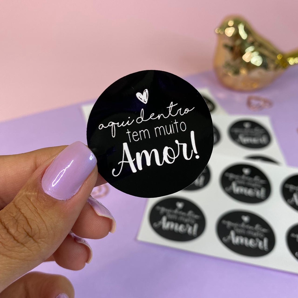 Etiqueta Adesiva 4x4cm, Lacre de Caixa Embalagem Correios "Aqui Dentro Tem Muito Amor"