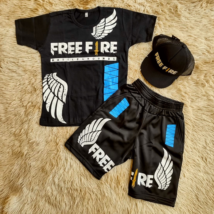 Conjunto Angelical Infantil Free Fire Masculino 3 Peças Camisa e Bermuda e Boné