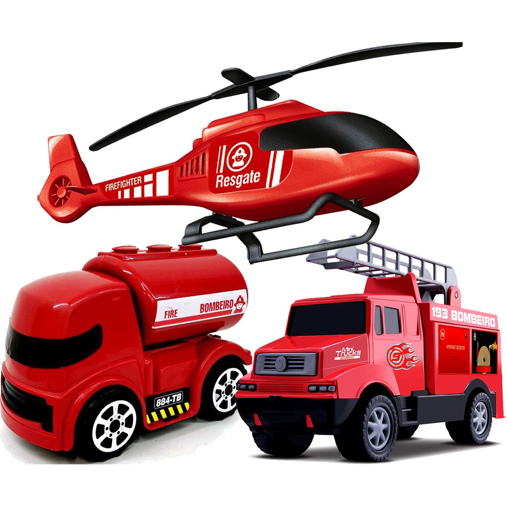 Kit Bombeiros Em Ação! Conjunto Com 3 Brinquedos De Bombeiro Carrinho Helicoptero E Tanque