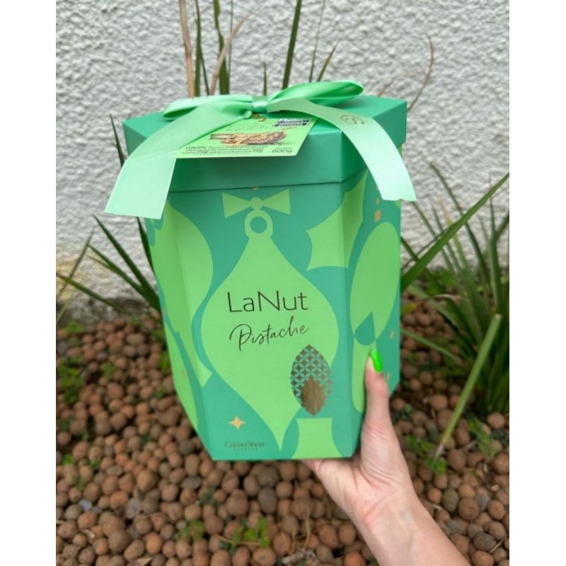 Panettone Pistache Cacau Show LaNut Coberto com Chocolate e creme de Pistache Fondue