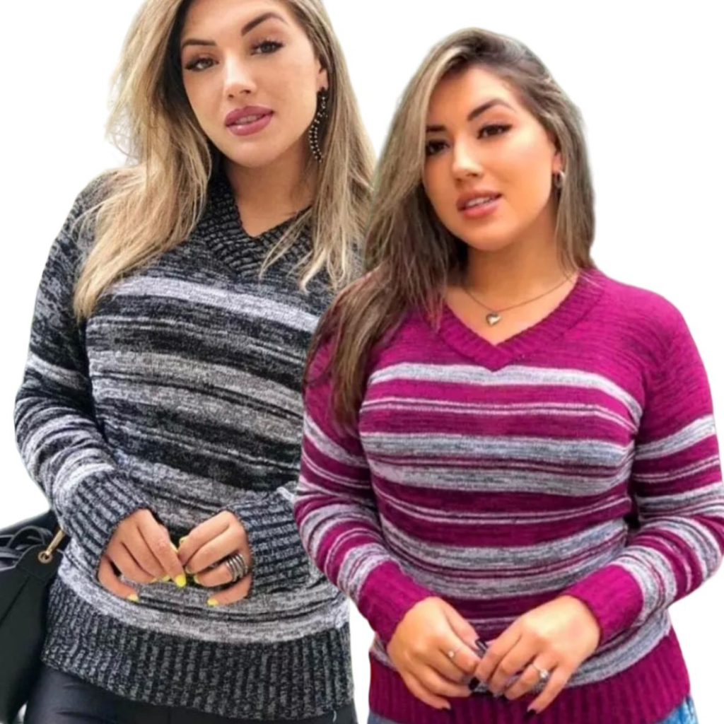 Blusa Feminina Tricot Kit 2 Blusas Manga Longa De Frio Gola V Suéter Inverno