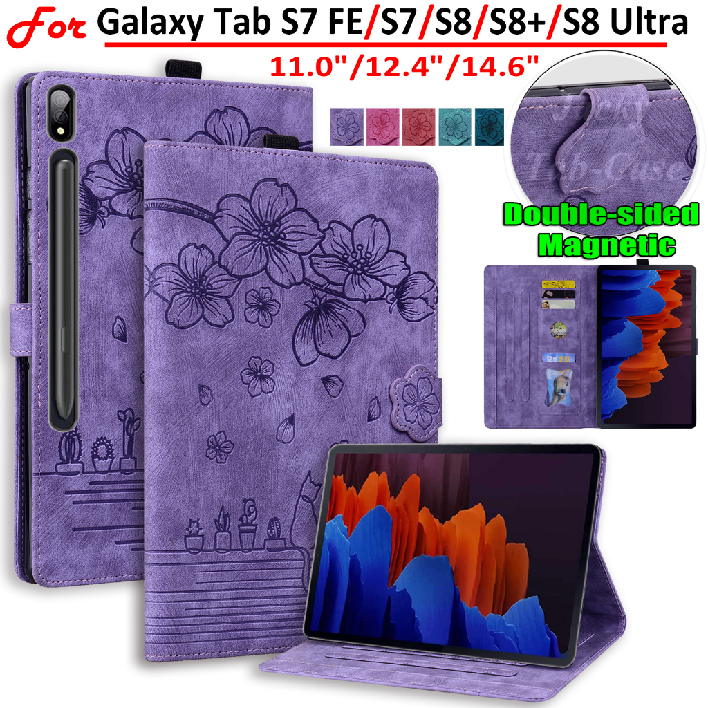 Para Samsung Galaxy Tab S7 FE (12,4 ") Romantic 3D Cherry Blossom Cat TabS7 S8 11,0 " S8+ S7+ Capa Magnética De Couro Flip SM-T730 T733 T736 T870 T873 T970 T976 X700 X800