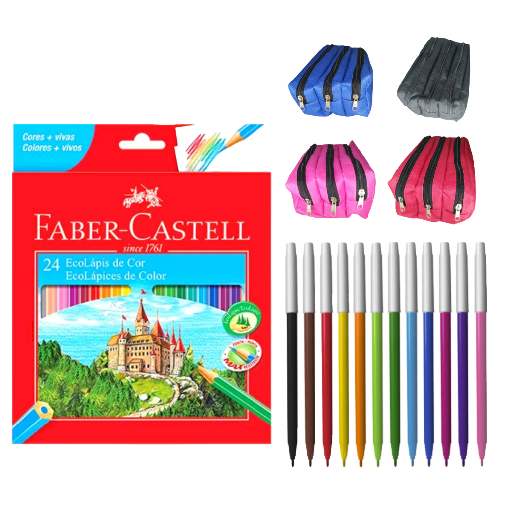 Kit Lapis de Cor Faber Castell 24 Cores + Canetinhas Coloridas Hidrográfica + Estojo Material Escolar
