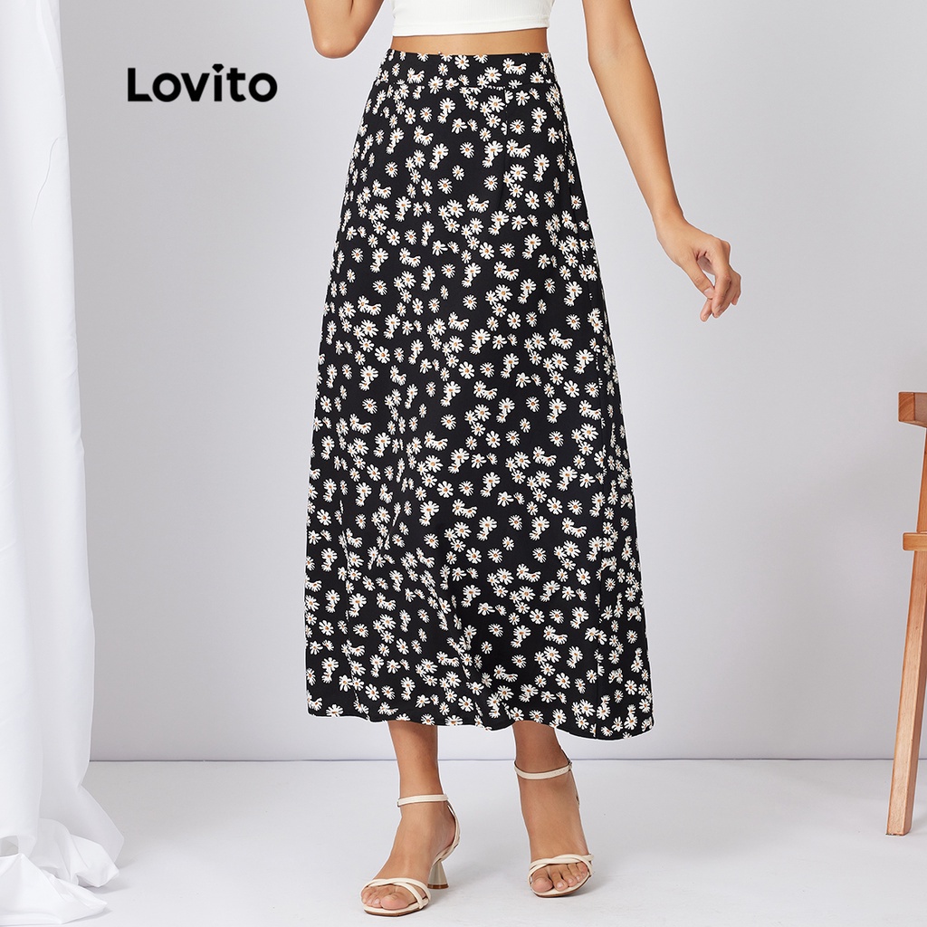 Lovito Saia Midi De Cintura Elástica Casual Ditsy Floral Linha A L21AS032 (Preta)