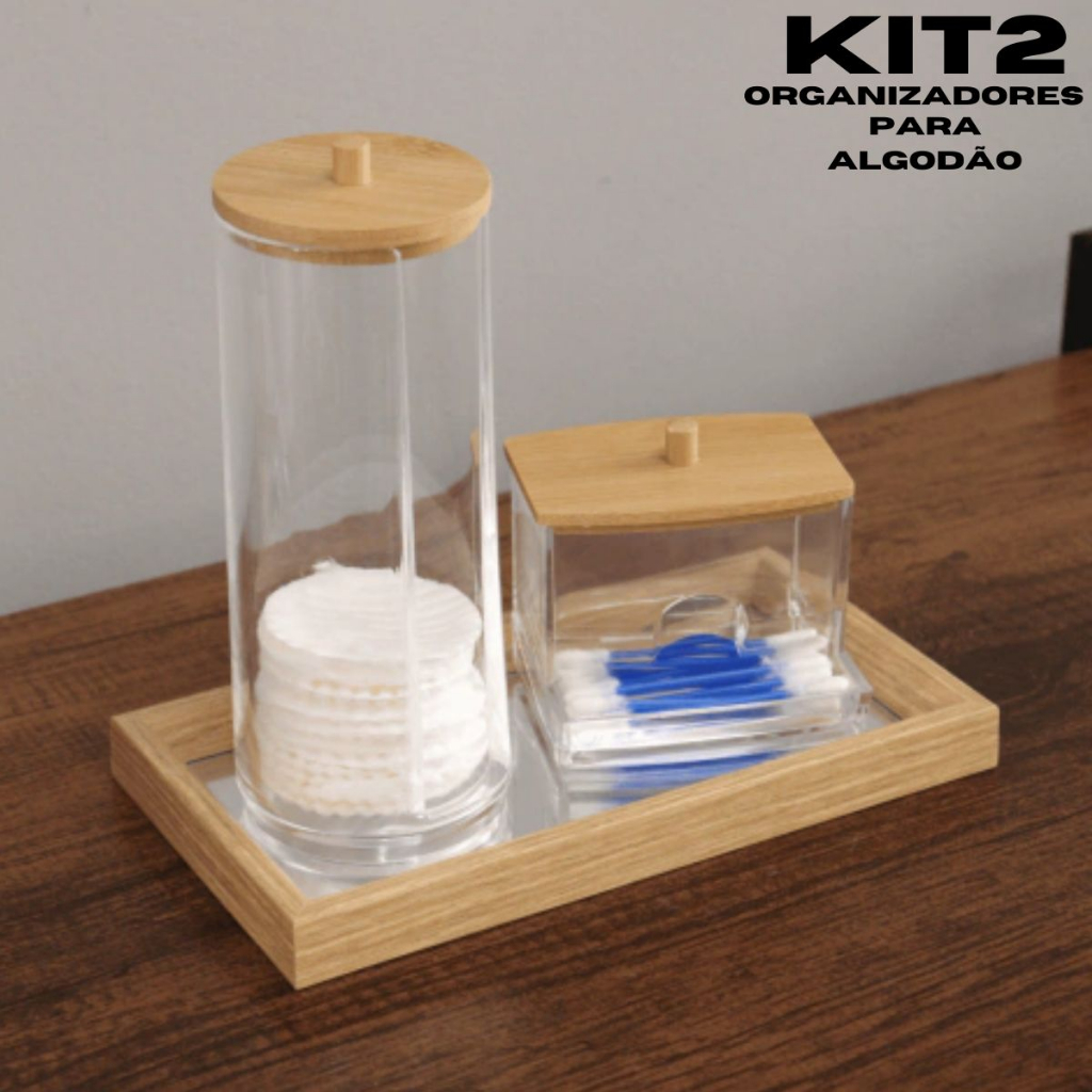 KIT2 Porta Algodão E Porta Cotonete Em Acrílico E Tampa De Bambu Organizador De Espaço