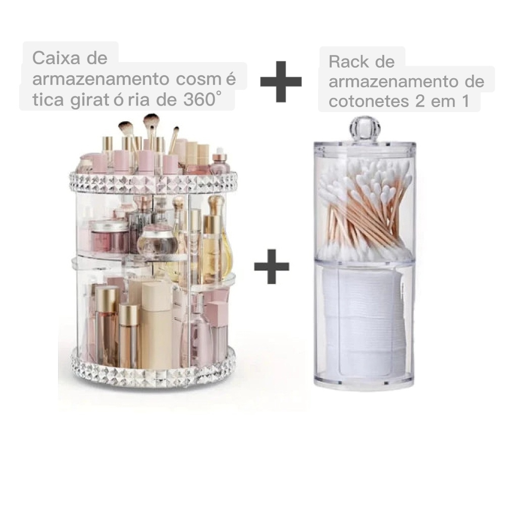 Kit De Organizador De Cosmético Maquiagem Acrílico Giratório 360º + Organizador Acrílico Porta Algodão E Cotonete 2 Em 1 Multifuncional