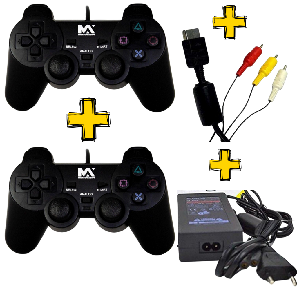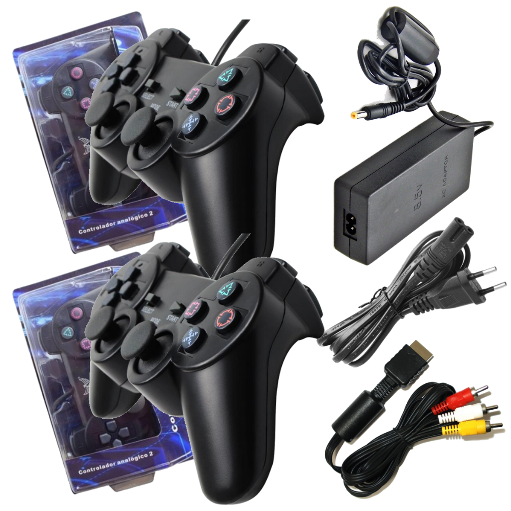 Kit Completo para PS2 e PS1 - 2 Controles + Cabo AV + Fonte - Reviva seu Playstation
