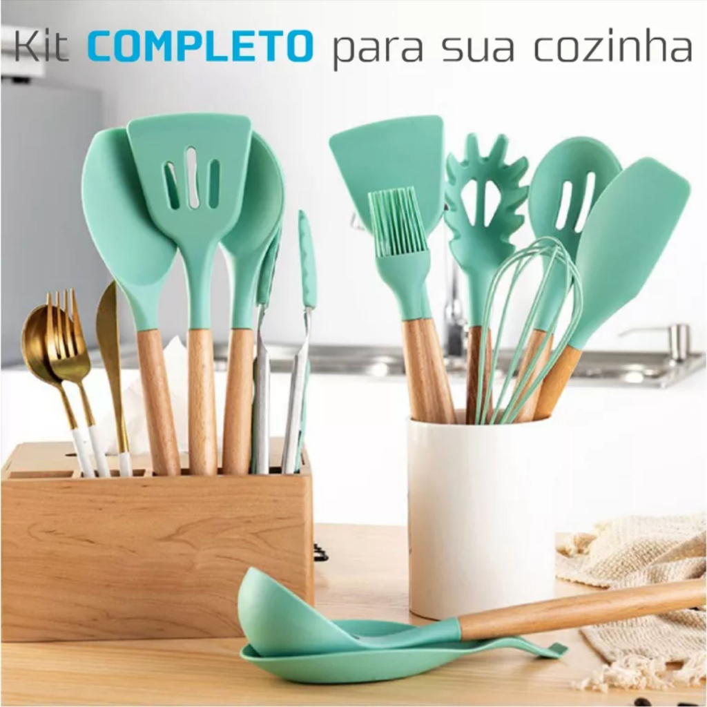 Kit 12 Pecas Utensilios De Cozinha Completo Silicone Cabo Em Madeira Espatula Pegador Concha