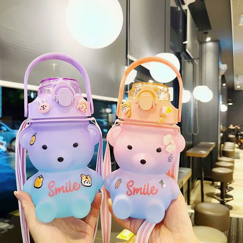 Garrafa De Agua Infantil Ursinho Fofo Smile 1000ml Alça com Canudo e Alça 3D ADESIVOS