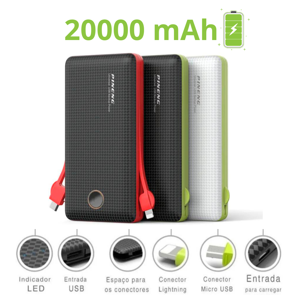 Carregador Portátil Power Bank 20000 mAh 3 em 1 Universal Lightning Tipo-C Micro USB Battery Pack