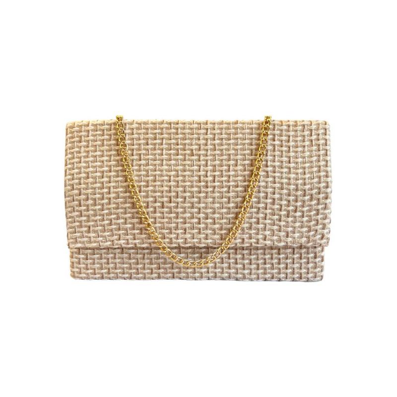 Bolsa de festa na cor palha trama trançada de ombro ou mão alça em corrente tamanho 10x16