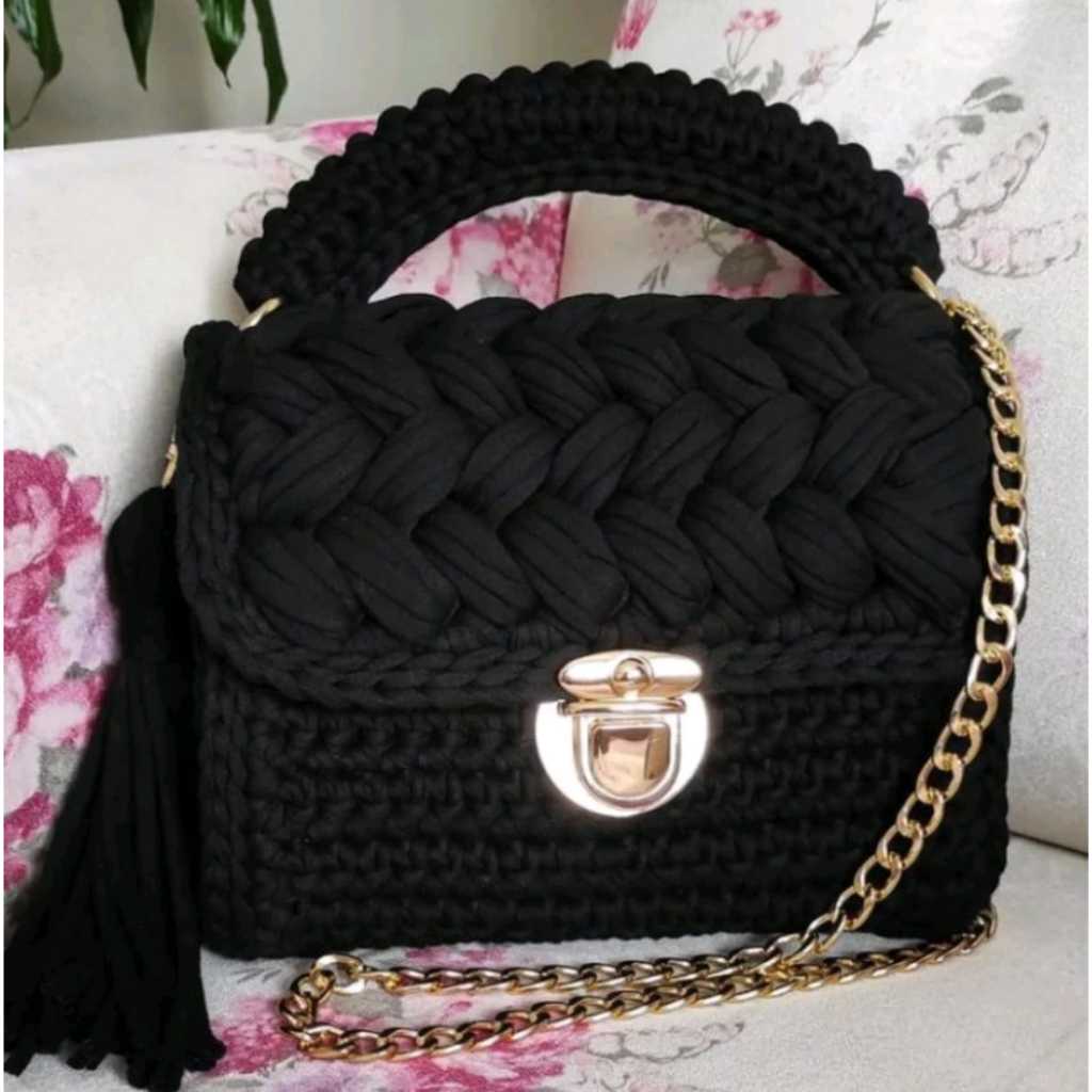 Bolsa de Ombro cor Preta Artesanal de Luxo em Fios de Malha