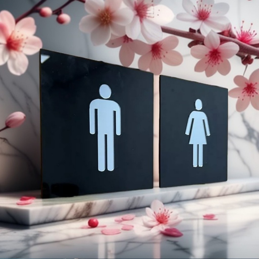 Placa Espelhada Indicativa de Sinalização de Toalete/Banheiro - Masculino e Feminino em Acrílico