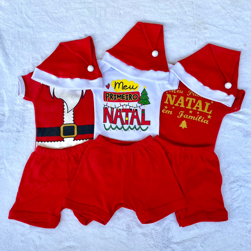 Conjuntinho Infantil De Natal (Body+Short+Gorro) | 100% Algodão