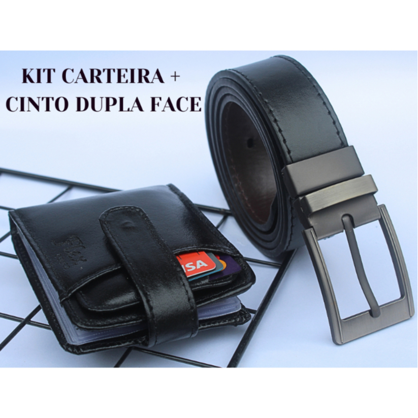 Kit Carteira Masculina Couro Legitimo + Cinto Dupla Face 2 Em1 Preto e Marrom com Fivela Giratória
