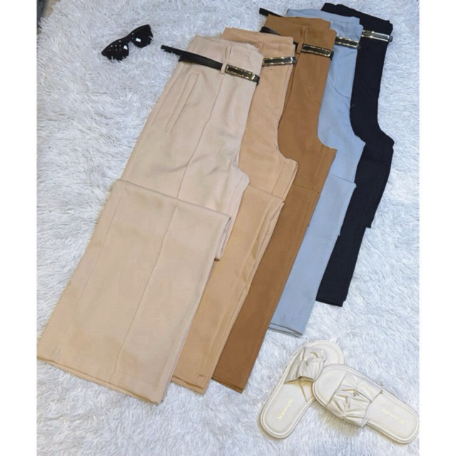 Calças jovens com corte elegante e cinto zíper na frente. cinto que acompanha a calça está nas fotos
