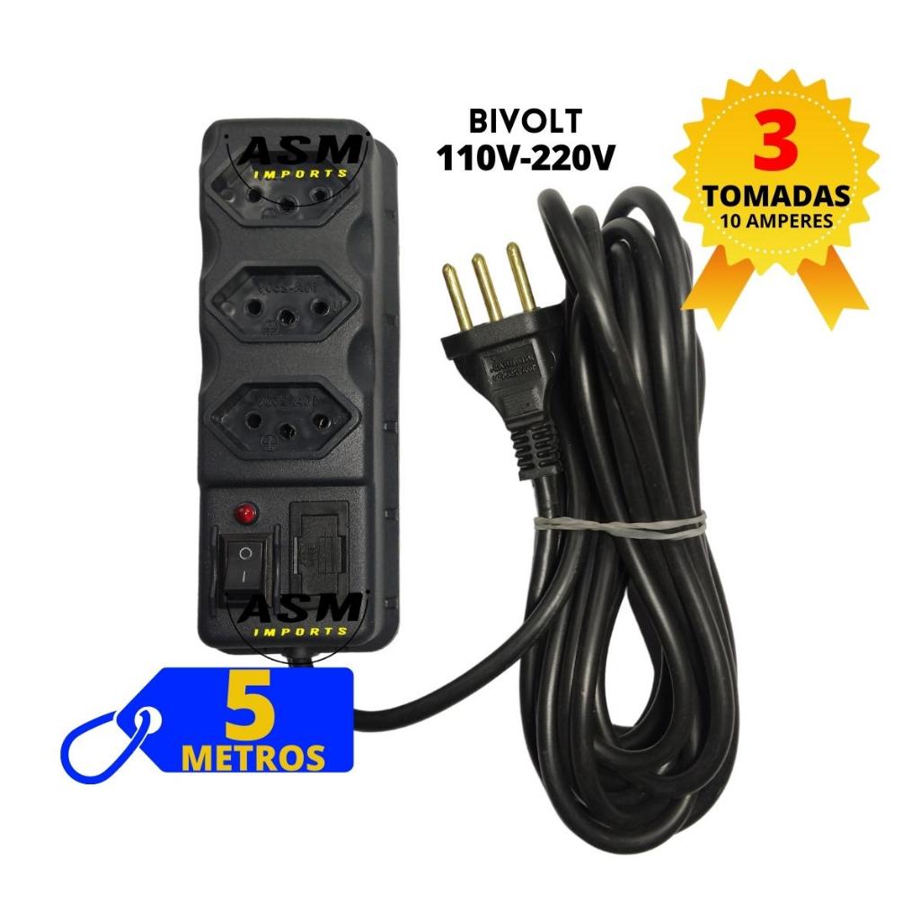 Filtro de Linha Régua elétrica 3 Tomadas Cabo 5 Metros de fio Fusível 110v-220v Bivolt