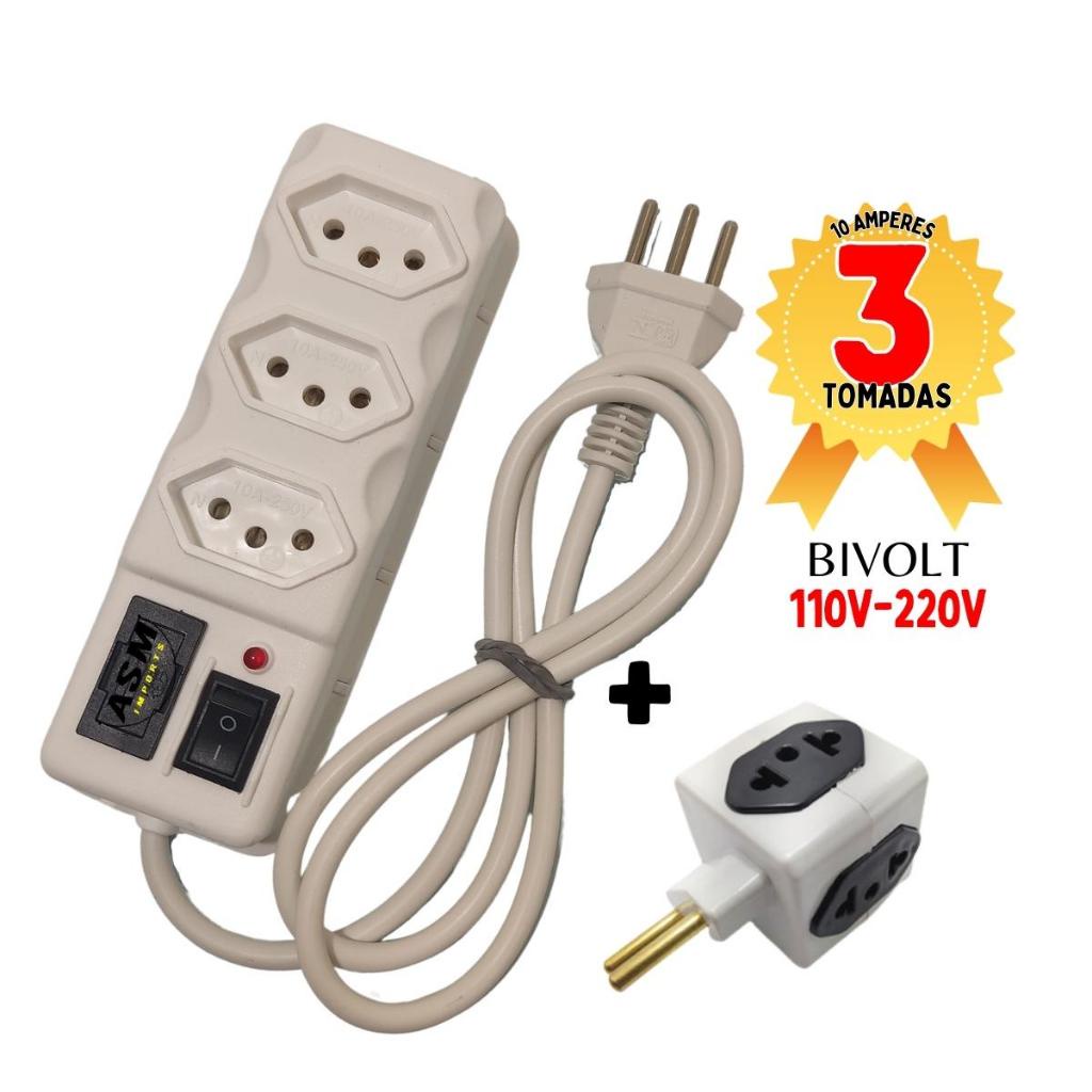 Regua Eletrica 3 Tomadas Bivolt Filtro de Linha + Cubo Adaptador de Tomadas