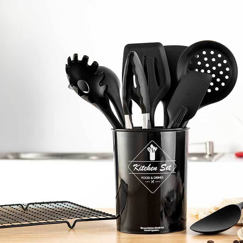 Kit Utensílios de Cozinha Com 5/12 Peças em Silicone com Cabo de Madeira Completo - CH