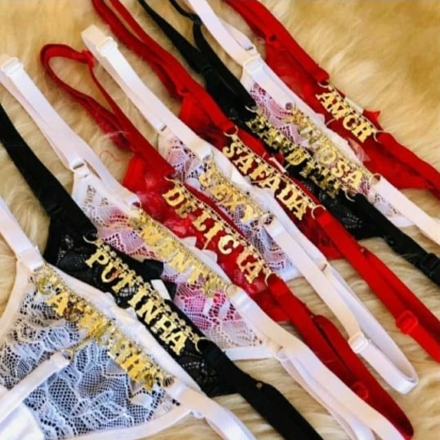Calcinha fio dental sexy pingente, com frase em biju e detalhe de strass com regulagem plus size 36 ao 54