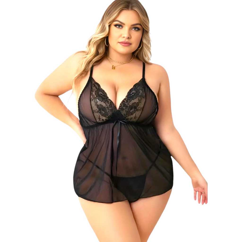 Camisola curta plus size sensual com transparência e detalhes 2356 de renda luxo acompanha calcinha fio dental