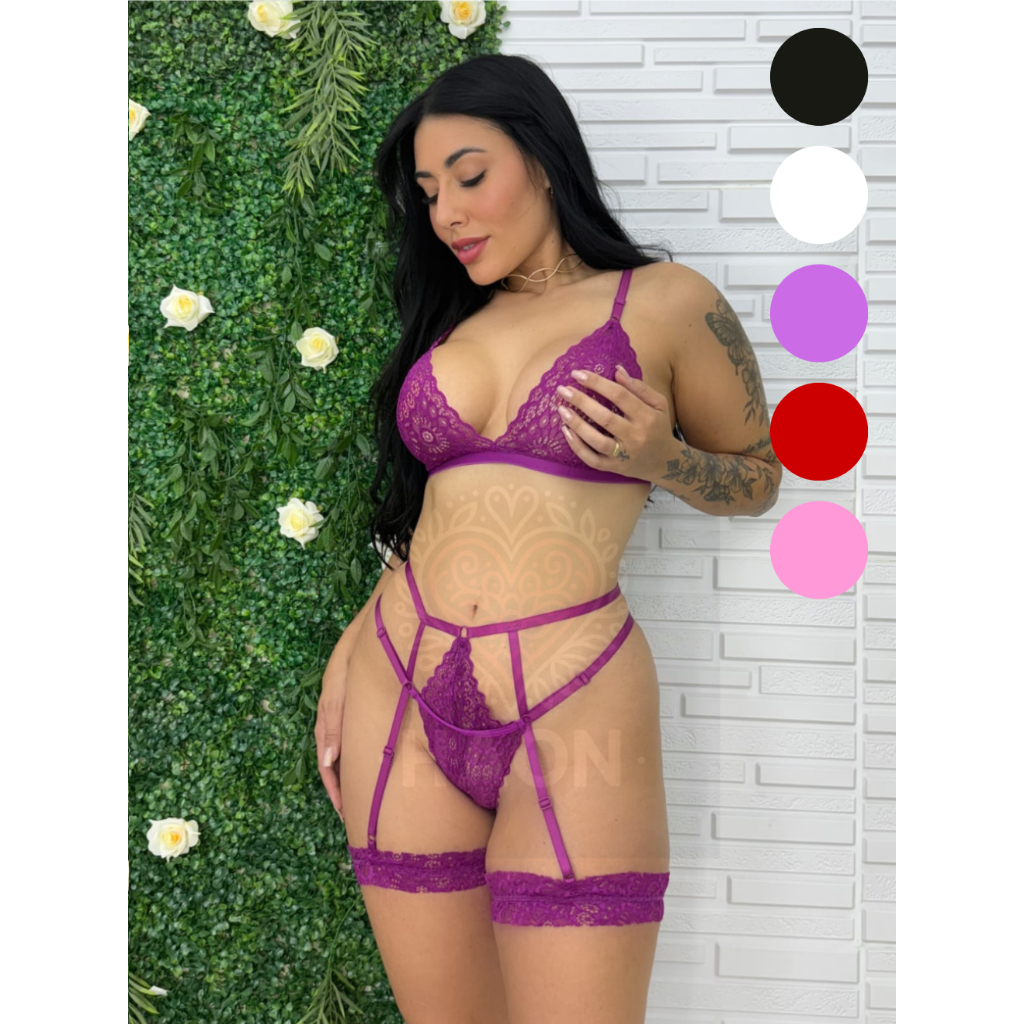 Lingerie Conjunto Luxo Sexy Cinta Liga Gladiadora + calcinha fio dental com Renda Erótica - P ao Plus Size